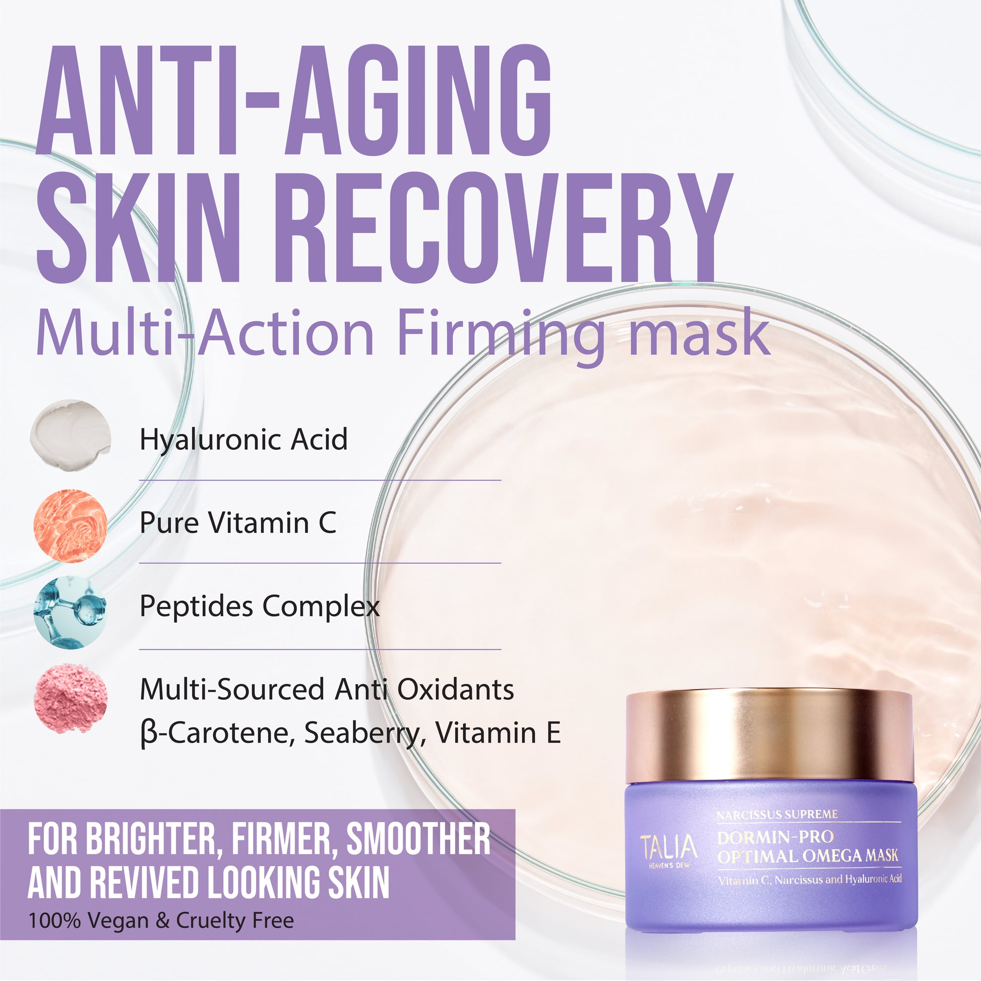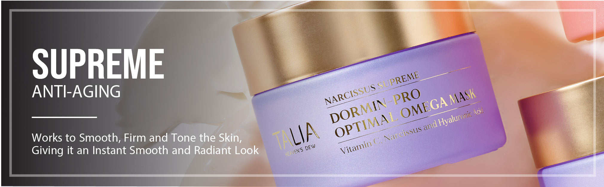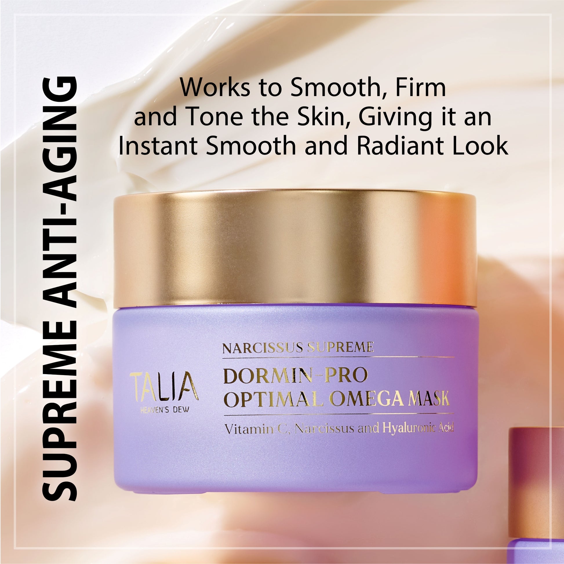A multitasking anti-aging firming mask offering remarkable results in 10 minutes. With a unique complex of peptides, Vitamin C, and Narcissus bulb extracts, this mask visibly firms and redefines the skin texture, promoting a more youthful appearance. Infused with white Water Lily extract to nourish and calm the skin. Powered by Talia’s Moisture & Nourish Blend of Cocoa, Shea Butter, and Sweet Almond Oil to provide instant nourishment and moisture. Making it ideal for mature and dull skin. Use twice a week as the final step of your skincare ritual to unleash your radiant and glowing skin.